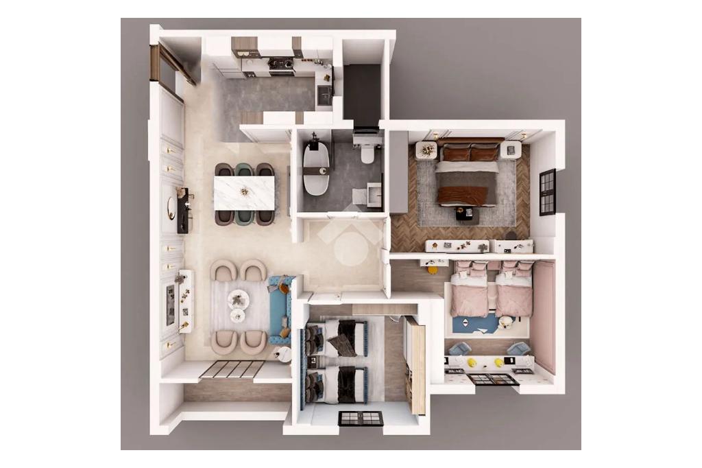 ingresso con salone a vista impreziosito da un camino, cucina abitabile con balcone soleggiato, tre ampie camere da letto, un servizio.