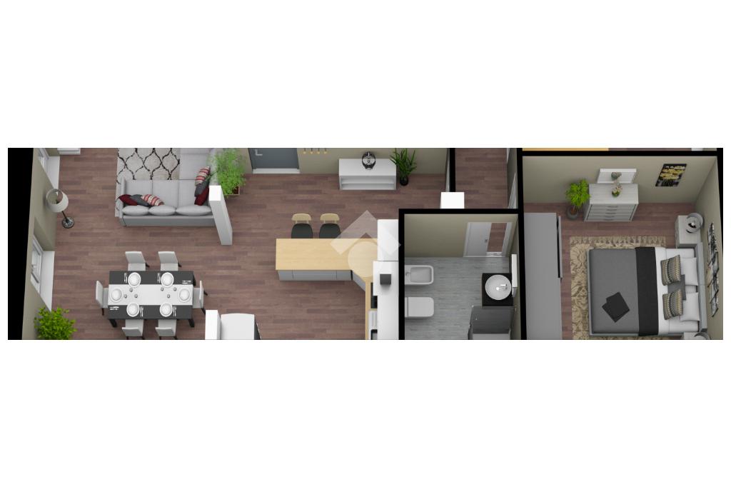 L’immobile è composto da: un ingresso che dà accesso a una zona living accogliente, un salone a vista, una spaziosa cucina abitabile con angolo cottura e sala da pranzo, una camera da letto e un servizio con doccia.